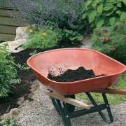 Load a 3ft by 3ft heap or bin with a balanced mixture of 'brown' carbon rich material, like dried leaves, straw, and wood chips, and 'green' nitrogen materials like fresh grass clippings and kitchen scraps.